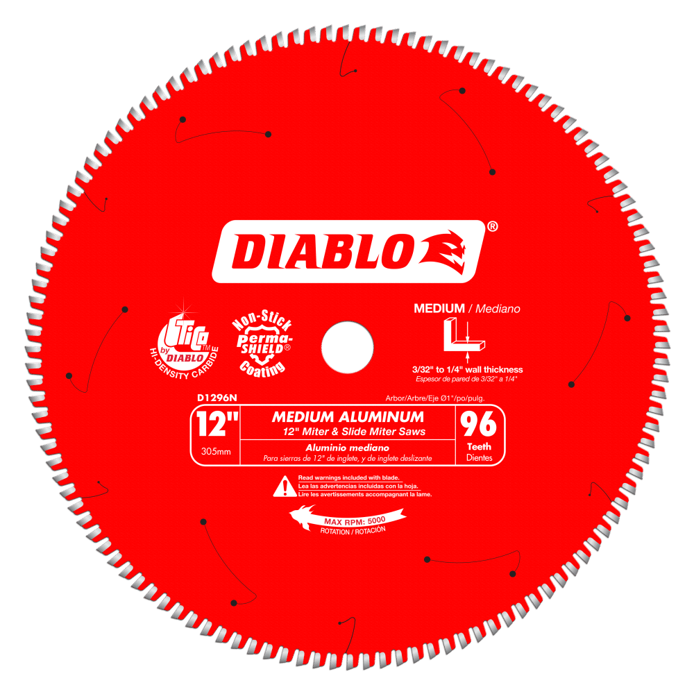 Diablo’s next generation Aluminum saw blades are optimized for cutting thin and thick aluminum metals. Featuring the new, specially formulated Diablo Super-Density Micro-Grain Carbide, these radical blades withstand impact, reduce wear, provide clog free cuts and last longer than standard carbide in metal cutting applications. The specially formulated metal cutting carbide teeth feature a Triple Chip Grind (TCG) Tooth Design for clean, burr-free finishes, virtually eliminating any type of rework. Tri-Metal Shock Resistant Brazing allows these Aluminum blades to slice through metal materials while withstanding extreme impact fo