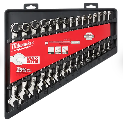 Milwaukee has designed our Combination Wrenches from the ground up, delivering maximum torque and ultimate user comfort. The MAX BITE™ Open-End Grip improves the wrench’s grip on nuts and bolts, and the geometry reduces rounding and stripping. MAX BITE™ offers 25% More Torque than competitive wrench designs. The Comfortable I-Beam Handle Design allows superior user comfort, even while applying high torque. Milwaukee wrenches feature Ink-Filled Size Labels for easy size identification, and quick distinction between SAE and metric sets. The 15pc kits come in a storage tray designed for Long-Term Storage, keeping your tool chest organized. Standing behind our products, Milwaukee offers a Lifetime Guarantee on all of our Combination Wrench Sets.