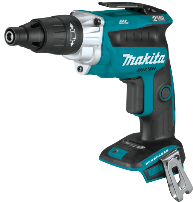 The 18V LXT® Lithium-Ion Cordless 2,500 RPM Screwdriver (model XSF05Z, tool only, batteries and charger sold separately) breaks new ground in high demand applications. It’s powered by a Makita brushless motor for longer run time, increased power and speed, and longer tool life. With the exclusive Push Drive™ Technology, the 18V 2,500 RPM Screwdriver can be set on lock-on mode so the motor starts only when the fastener is engaged. This gives contractors a quieter work environment, and also saves on battery power. It’s built for added durability with Extreme Protection Technology (XPT™), which is engineered for improved dust and water resistance for operation in harsh job site conditions. It is ideal for hanging sheetrock, metal framing, installing subfloors, backer board, and decking applications.