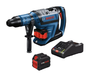 This 18V SDS-max® 1-7/8 In. rotary hammer delivers corded-type performance for heavy-duty concrete drilling and chiseling jobs. The Bosch GBH18V-45C Rotary Hammer delivers 9.3 Ft.-Lbs. of impact energy (EPTA). That is unprecedented for a single-battery 18V SDS-max® 1-7/8 In. rotary hammer. It weighs 20.4 Lbs. (with included battery). This hammer is part of the PROFACTOR™ System, which pairs BITURBO Brushless™ Technology with a CORE18V® High Power Battery. BITURBO Brushless™ Technology is a high-performance motor and drive-train system designed to deliver power comparable to high-demand corded tools. It has KickBack Control, rotary hammer and hammer-only modes, and Vario-Lock to rotate and lock the chisel. The anti-vibration system features a longer air cushion in the hammer tube and dampeners in the handle. It also has Soft Start and controlled rpm and bpm, making it easier to control drilling and chiseling applications. The hammer features an on-tool user interface for tool performance, feedback, and control. It has connectivity (module sold separately) to link to connected device via Bosch Toolbox App to customize settings and receive detailed feedback. The kit includes two CORE18V® 12 Ah High Power Batteries, which deliver equal power and at least 50% more runtime than the CORE18V® 8 Ah battery, powering high-demand applications. At only 3.04 Lbs., this 12 Ah battery provides performance comparable to larger and heavier alternatives. The kit has a GAL18V-160C battery turbo charger, providing 16-amp charging current for fast and faster charging, with an optional Power Boost™ mode.