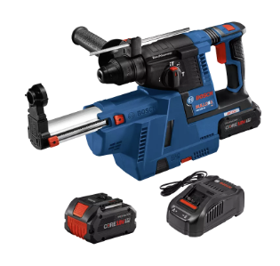 This Bosch 18V Bulldog™ hammer consistently outperforms the best-selling 1 In. corded 11255VSR Bulldog™, making it better than the best. The Bosch GBH18V-26K24AGDE kit pairs two CORE18V 8.0 Ah PROFACTOR Performance Batteries with an SDS-plus® Bulldog™ 1 In. Rotary Hammer that delivers 1.9 Ft.-Lbs. of impact energy (EPTA). The included dust-collection attachment provides a self-contained HEPA dust solution for max mobility. The hammer’s brushless motor maximizes battery runtime for extended performance. It also has KickBack Control, an integrated sensor to stop tool rotation in bind-up situations; Electronic Precision Control, for smoother bit starts; and Vibration Control, for extended user comfort. It weighs only 8.4 Lbs. (with included battery). The kit features two CORE18V PROFACTOR Performance Batteries. The CORE18V 8.0 Ah PROFACTOR Performance battery delivers 100% more runtime and over 75% more power than the CORE18V 4.0 Ah battery for high-demand applications. Each battery is engineered with 21700 cell technology and the exclusive CoolPack 2.0 technology to manage the heat of the higher power-density cells. The dust collector has a HEPA filter, helping users of the 18V 1 In. GBH18V-26 Bulldog™ rotary hammer move toward compliance with OSHA silica dust regulations.