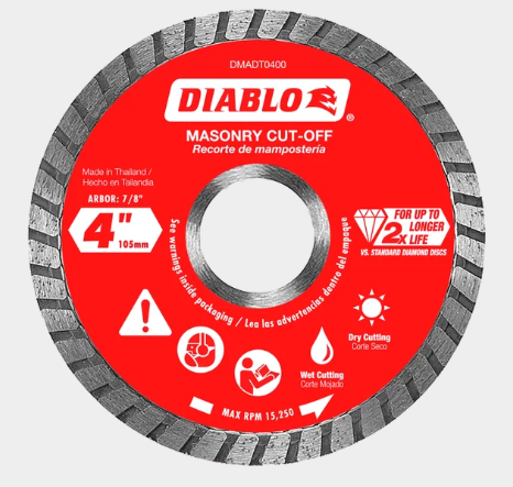 Diablo’s diamond turbo masonry cut-off discs provide extreme durability and longer life in concrete, brick and cinder block applications. These continuous rimmed diamond discs deliver up to 2X longer cutting life versus standard diamond cut-off discs. The disc’s industrial-grade diamonds coupled with a hardened disc body delivers lasting durability and maximizes cutting quality in hardened materials even in extreme applications.