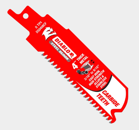 Diablo’s Steel Demon™ Carbide Teeth Reciprocating Saw Blades for Thick Metal are the first carbide-tipped blades designed for extreme metal cutting; including high strength alloys, cast iron, and stainless steel. High performance TiCo Hi-Density carbide blade delivers an unmatched up to 50X longer cutting compared to standard bi-metal blades in extreme metal cutting applications between 3/16” to 9/16”. An oversized blade body helps produce straighter cuts with less vibration and chatter, while an enhanced carbide tip-to-blade connection provides extreme impact resistance. Diablo’s Perma-SHIELD® non-stick coating helps each blade resist heat and prevent gumming and corrosion.