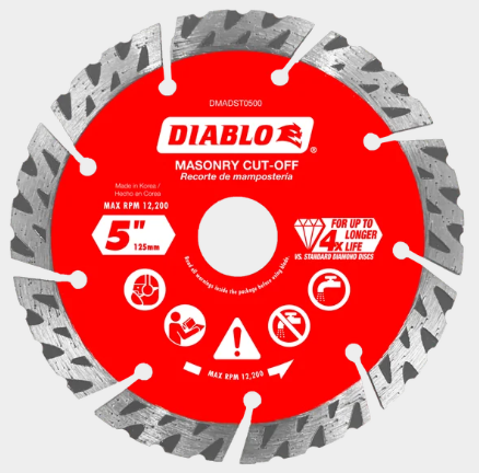 Diablo’s diamond segmented turbo rim masonry cut-off blades provide extreme durability, faster cuts and longer life in concrete, concrete with rebar, brick and cinder block. These diamond rimmed discs deliver up to 30% faster cuts versus standard diamond cut-off discs. The disc’s industrial-grade diamonds with hardened disc body delivers lasting durability and maximizes cutting quality in hardened materials even in extreme applications.