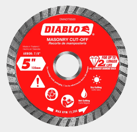 Diablo’s diamond turbo masonry cut-off discs provide extreme durability and longer life in concrete, brick and cinder block applications. These continuous rimmed diamond discs deliver up to 2X longer cutting life versus standard diamond cut-off discs. The disc’s industrial-grade diamonds coupled with a hardened disc body delivers lasting durability and maximizes cutting quality in hardened materials even in extreme applications.
