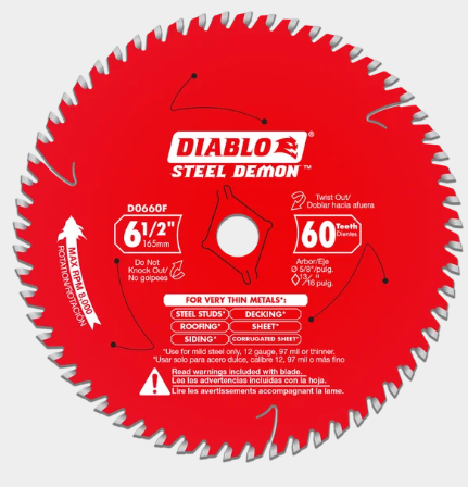 Diablo’s Steel Demon™ Carbide Saw Blades for Thin Metal produce fast, accurate cuts in a wide-range of mild steels. These blades feature Diablo made TiCo™ Hi-Density Carbide engineered exclusively to deliver maximum performance, superior quality cuts and longer life when compared to standard grinding discs. Designed with a Triple Chip Grind (TCG) and Perma-SHIELD® coating, these blades slice through the toughest of metals to produce precise, burr-free cuts with less sparks. A controlled cutting action produces larger chip sizes that generates less dust and airborne contaminates. The thin kerf body minimizes material removal and requires less cutting power, delivering fast, clean cuts in cordless and corded circular saws.