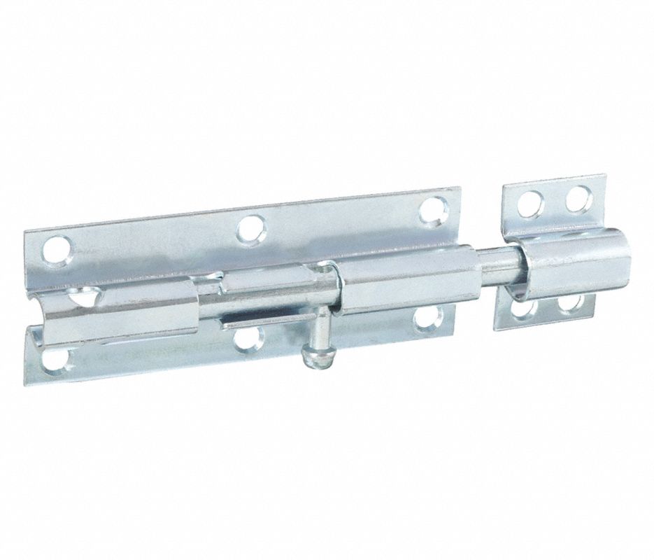 Heavy-Duty Bolts – Surfaces Strike Only. Padlockable, heavy construction provides enhanced security for door and gates, complete with surface strike, mounts easily. 13/32 inch bolt diameter. Bolt length 6 inches, bolt bracket 6 inches x 1-5/8 inches. Zinc plated finish.
