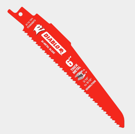 Diablo’s Bi-Metal Reciprocating Saw Blades for Thick Metal are specifically designed for maximum performance in extreme metal demolition applications. The blade’s ultra hardened cutting edge delivers up to 5X longer life than those of standard blades. Dual Tooth design features a double tooth configuration with small gullets for faster material removal and extra durability.