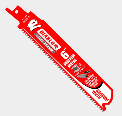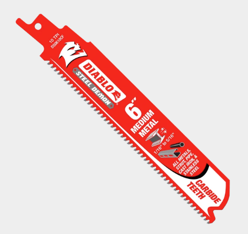 Diablo’s Steel Demon™ Carbide Teeth Reciprocating Saw Blades for Medium Metal deliver up to 50X longer cutting life and cleaner finishes in strut, pipe, stainless steel and all other metals ranging in 1/16″ to 5/16″ thickness.