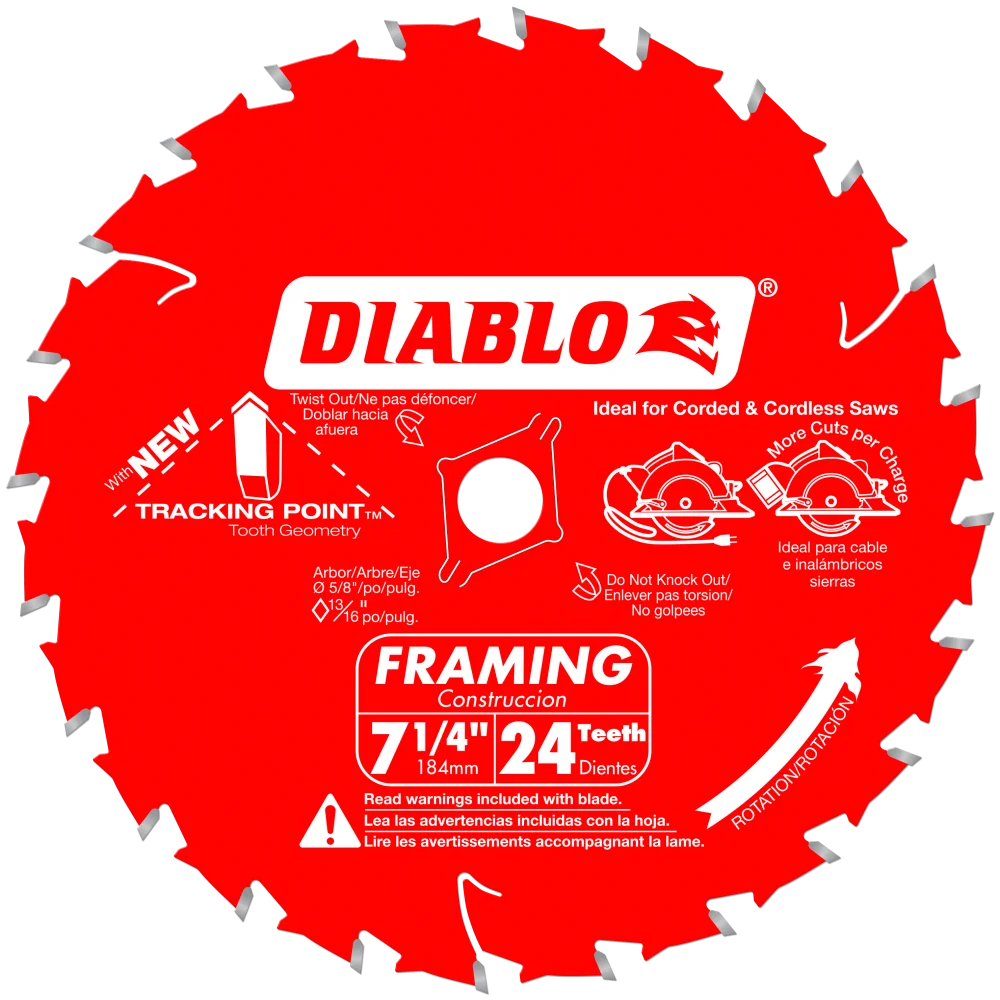 Next generation 7-1/4†24T Framing Blade with Tracking Point™ Tooth design delivers maximum life and durability with effortless cutting performance. This is the only 7-1/4†blade on the market to include Tracking Point™ Tooth design; making it is ideal for framers, roofers, remodelers, concrete formers or anyone wanting ultimate cutting performance in pressure treated wood, 2x lumber, plywood, hardwoods & softwoods.