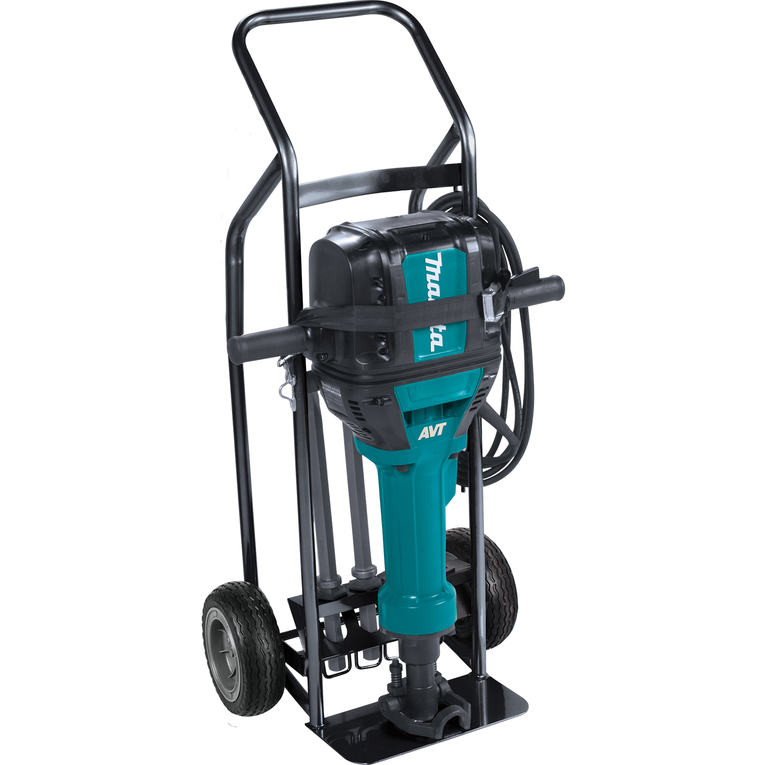 The new 70 lb. AVT® Breaker Hammer is engineered to hit like an air hammer, but with less noise and vibration. It has a powerful 15 AMP motor that delivers a full 53.9 ft.lbs. (73.8 Joules) of impact energy, so contractors get hard-hitting performance. Users also benefit from less noise and lower vibration than an air hammer, and zero hassle with an air hose and compressor. The HM1812 features the latest Advanced AVT® Technology, a synchronized three-component system that more effectively reduces vibration. The internal mechanical counterbalance system, vibration-absorbing housing, and fixed movement handles are engineered for significantly less vibration during concrete breaking applications. Model HM1812X3 is a kit and also includes a Premium Hammer Cart, as well as two 1-1/8″ x 20-1/2″ Flat Chisels (1-1/8″ Hex) and two 16″ Self-Sharpening Bull Point bits (1-1/8″ Hex).