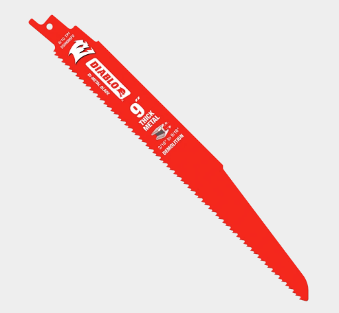 Diablo’s Bi-Metal Reciprocating Saw Blades for Thick Metal are specifically designed for maximum performance in metal demolition applications. The blade’s ultra-hardened cutting edge delivers up to 5X longer life compared to standard bi-metal blades. Dual Tooth design features a double tooth configuration with small gullets for faster material removal and extra durability. An oversized 1″ blade body delivers straighter cuts with less vibration and chatter while Perma-SHIELD non-stick coating protects the blade from heat buildup, preventing gumming and corrosion.