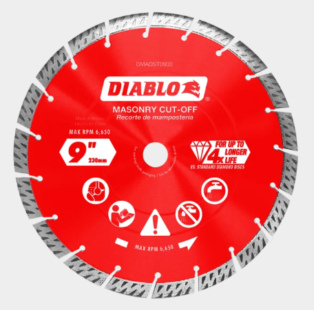 Diablo’s diamond segmented turbo rim masonry cut-off blade provide extreme durability, faster cuts and longer life in concrete, concrete with rebar, brick and cinder block. These diamond rimmed discs deliver up to 30% faster cuts versus standard diamond cut-off discs. The disc’s industrial-grade diamonds with hardened disc body delivers lasting durability and maximizes cutting quality in hardened materials even in extreme applications.