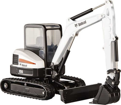 The Bobcat® E55 mini excavator is a conventional tail swing model that packs a heavy punch. The conventional tail swing makes it easier to move your machine through confined spaces such as doors and gates, and onto trailers. The E55 mini excavator is available with a long arm option that maximizes dig depth, reach and dump height clearance.