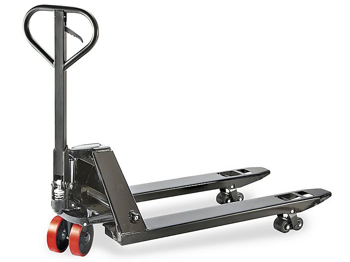 Pallet Jack Fork Size: 48″Long x 27″with a 5500 LBS lifting capacity. Distance Between Forks (Inside): 14 3/8″
