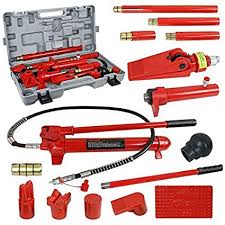 Hydraulic ram set includes a hydraulic hand pump, cylinder, and other compatible attachments.