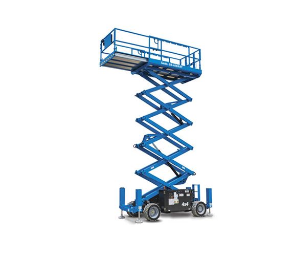 The Genie® GS™-2669 RT rough terrain scissor lift is a tough, construction-oriented four-wheel drive machine with positive traction control, which can increase operator productivity on demanding outdoor worksites.