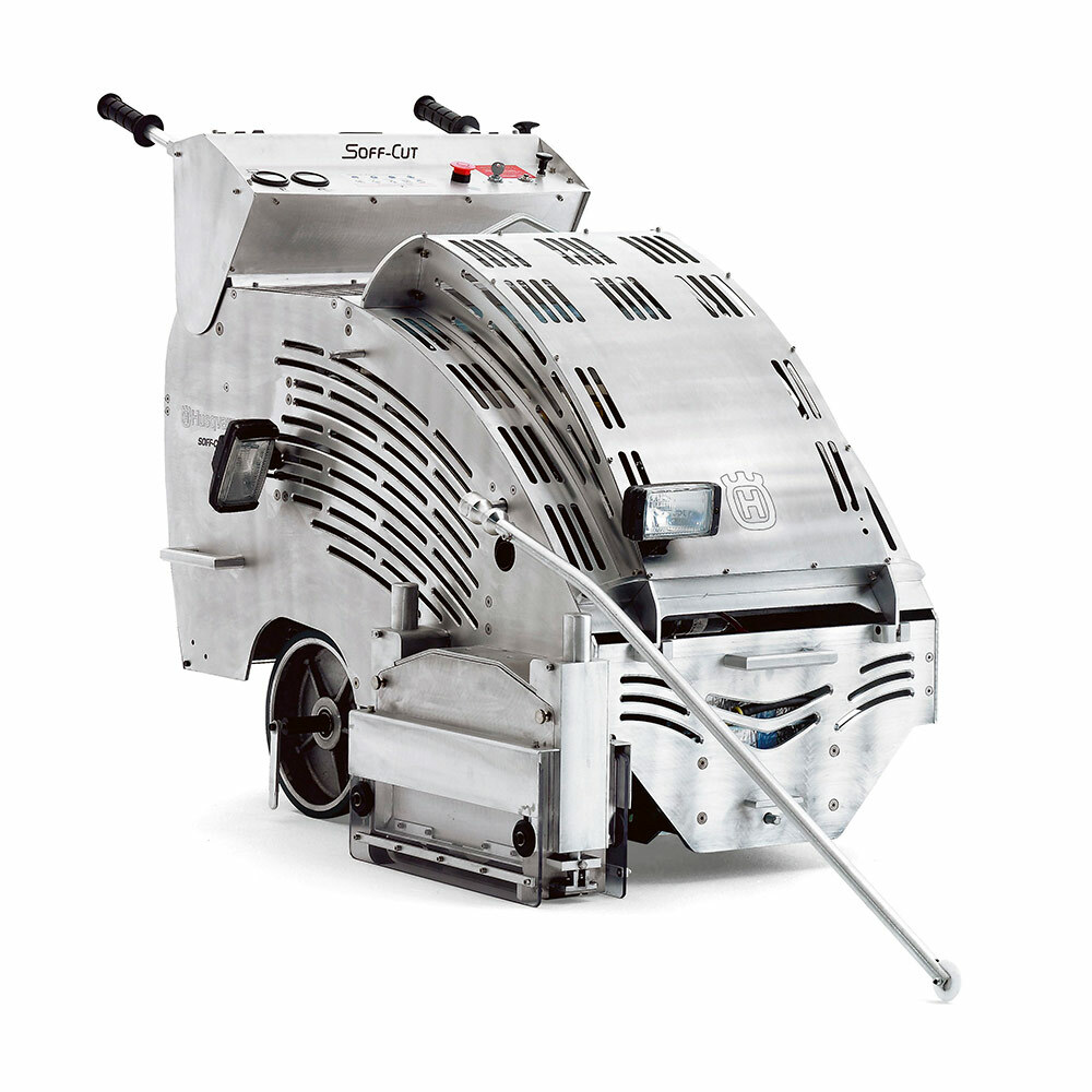 The Husqvarna Soff-Cut 5000 Paver self-propelled gas saw is designed for highway and paving applications. Features include a 27 hp engine with overhead valves, heavy-duty air cleaner, electric start, full pressure lubrication, hydraulic valve lifters, and a mechanical fuel pump. Several blade widths can be used, allowing different joint widths and crack control simultaneously. The unique saw design allows for a 4″ depth of cut.