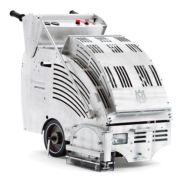 The Husqvarna Soff-Cut 2500 self-propelled dry cutting gas saw has a low noise enclosed design and is ideal for medium to heavy-duty commercial, industrial, and paving applications. The 2500 is designed for versatility, ease of use, and high production capabilities. Three-blade widths can be used, allowing for different joint widths and crack control simultaneously. Features include a 13 hp engine, halogen lighting system, electric remote key start, and a cyclone air cleaner to increase engine longevity.