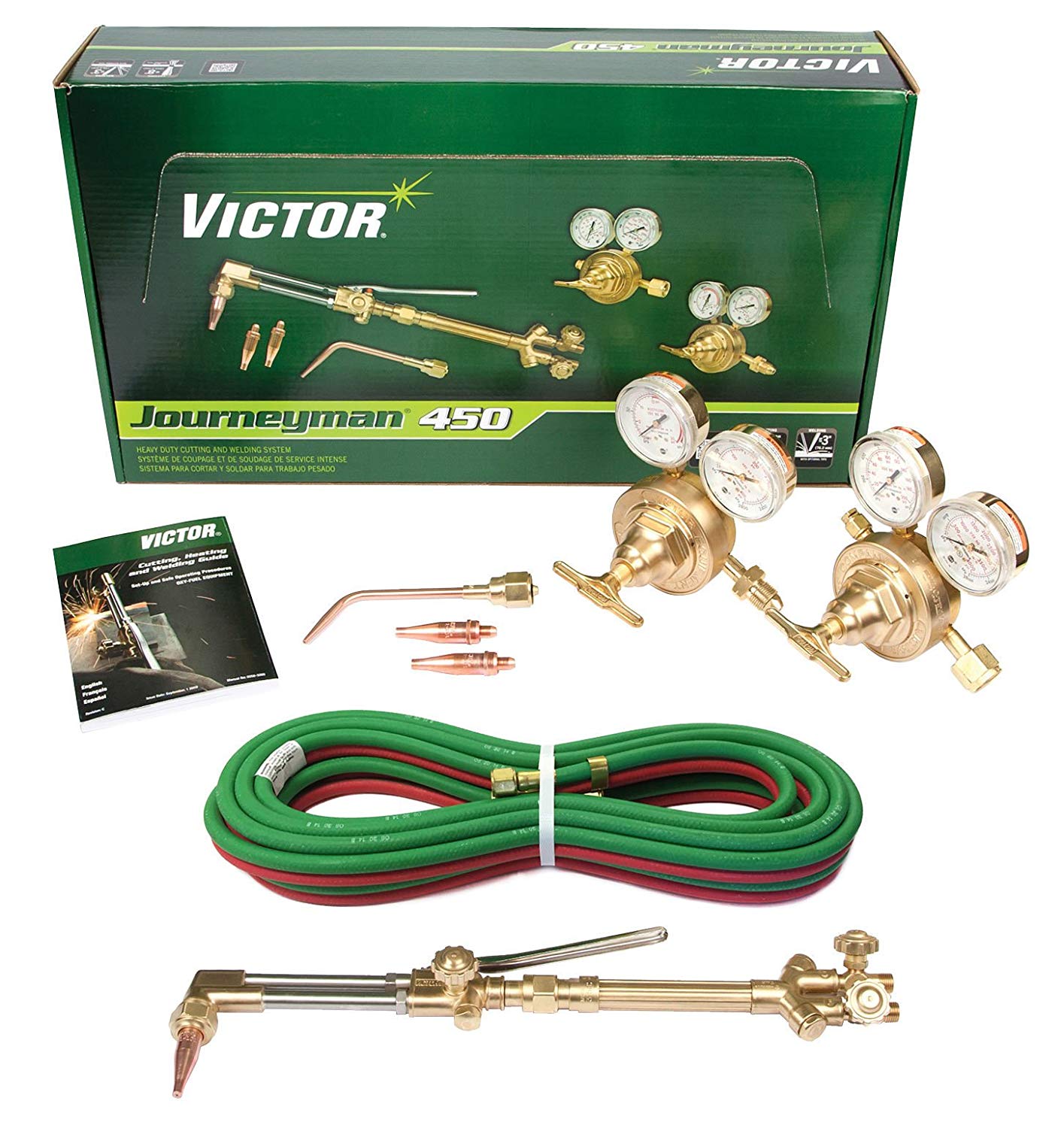 Victor oxygen and acetylene cutting torch. Kit includes 2 gauges, gloves, goggles, striker, cleaning kit, wrenches, 50FT of hose, flash arrestors, and torch handle.