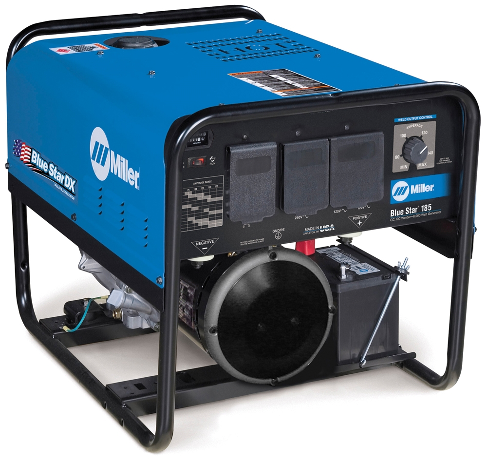 Gas-powered 185 amp arc welder, pull start. 120 VAC GFCI and 240 VAC receptacles, auto-idle, 6.25-gallon fuel capacity, and engine hour meter. Includes selectable welder output control. Includes 50 FT welding leads.